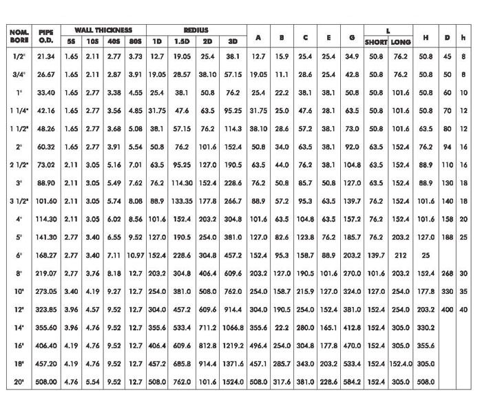 RADIUS : Radius of Short Radius Elbow is 1 times nominal pipe diameter, Radius of Long Radius Elbows is 11/2 time nominal pipe diameter.