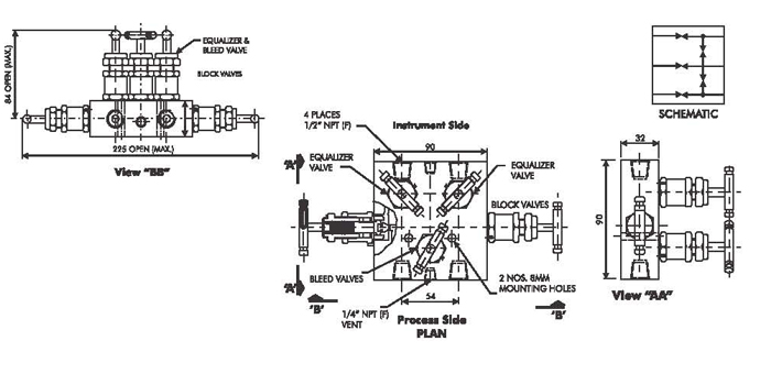 WINFLOW 5 Valve Manifold Pipe to Pipe design for connecting system impulse lines and transmitters. This valve consist of 1/2" NPT Female connections on 54 mm. (2-1/8") centers to suit the inlet connection. This Valve provides two instrument isolating valves, Two equalizer valves and One bleed valve. (For Testing)