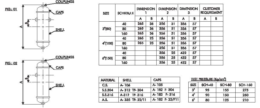 Seal pots/Condensate chambers are available in carbon steel to ASTM A 106. All Grades of Stainless and other alloy steel fabricated from Seamless pipe with inside cleaned and checked to assure desired volume. Standard pipe sizes are 2" to 6". Connection fittings are NPT or welded socket adaptors, Butt Weld etc.